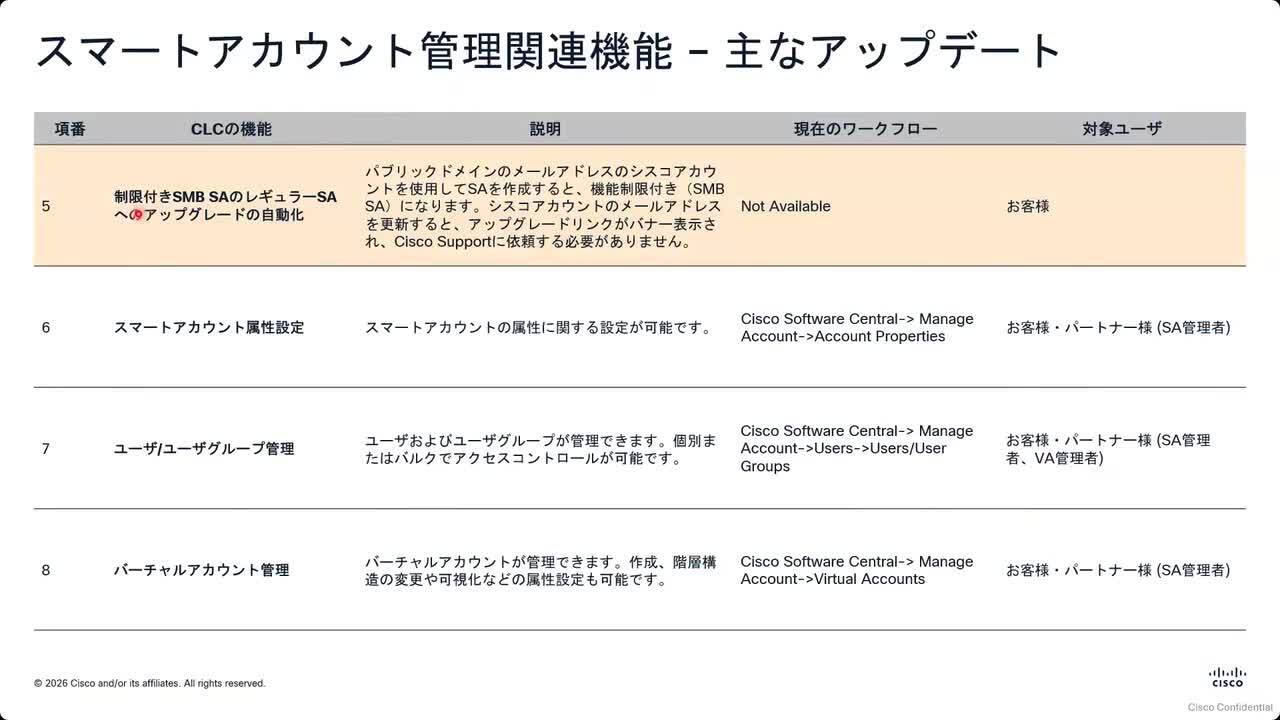 Cisco License Centralに統合されたスマートアカウント管理機能をご紹介します。スマートアカウントの作成、注文へのスマートアカウントの割り当てなどについて詳しく解説します。