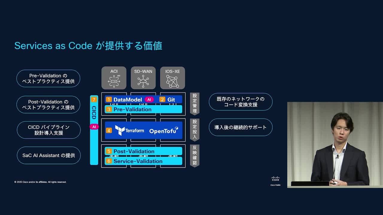 AI 活用の加速に伴い、IT インフラの運用にも変革が求められています。 これまでの属人的だったインフラ運用を、コードと AI を組み合わせることで自動化、さらには自律化へ。 その実現を支援する Cisco Customer Experience の「Services as Code」を、デモを交えてご紹介します 。